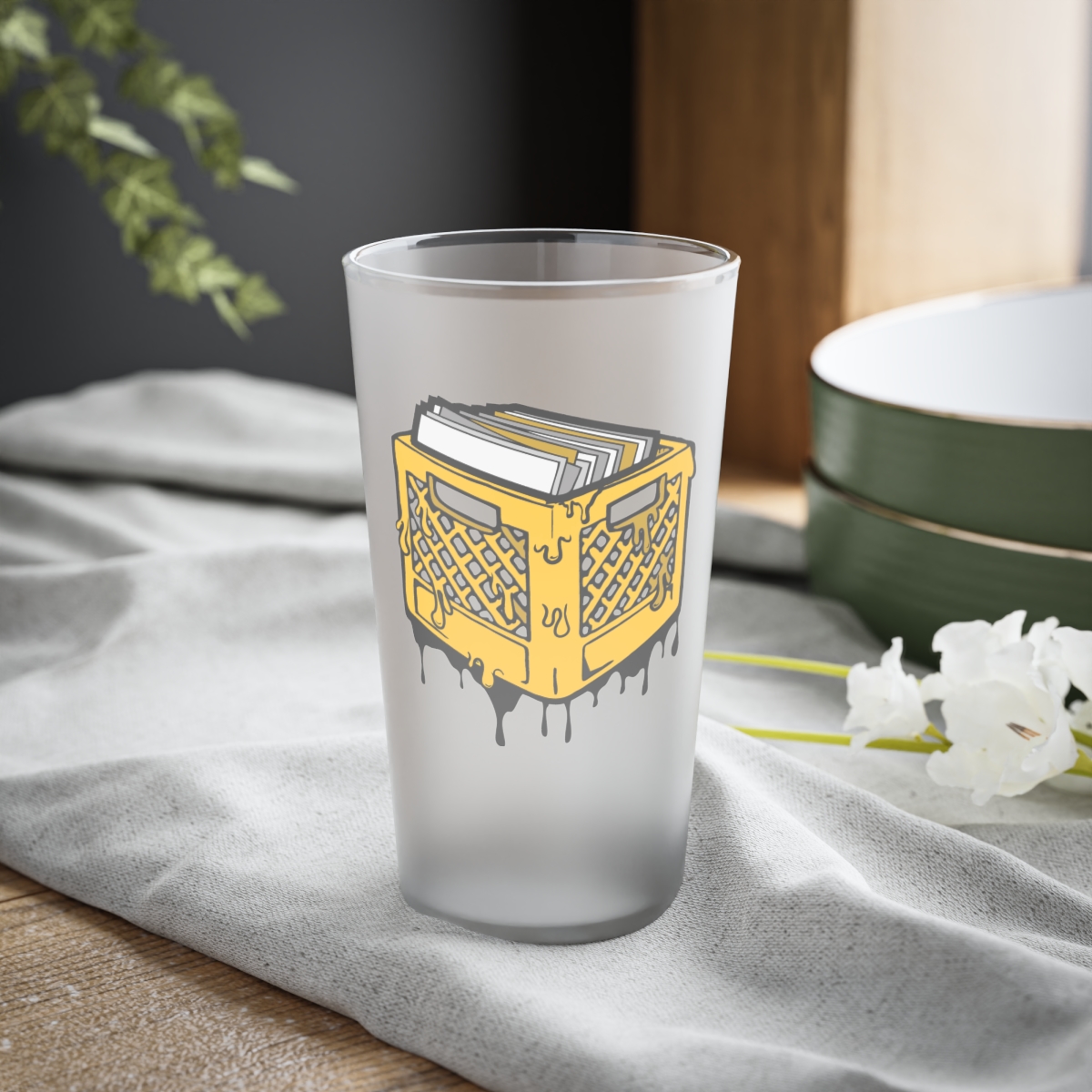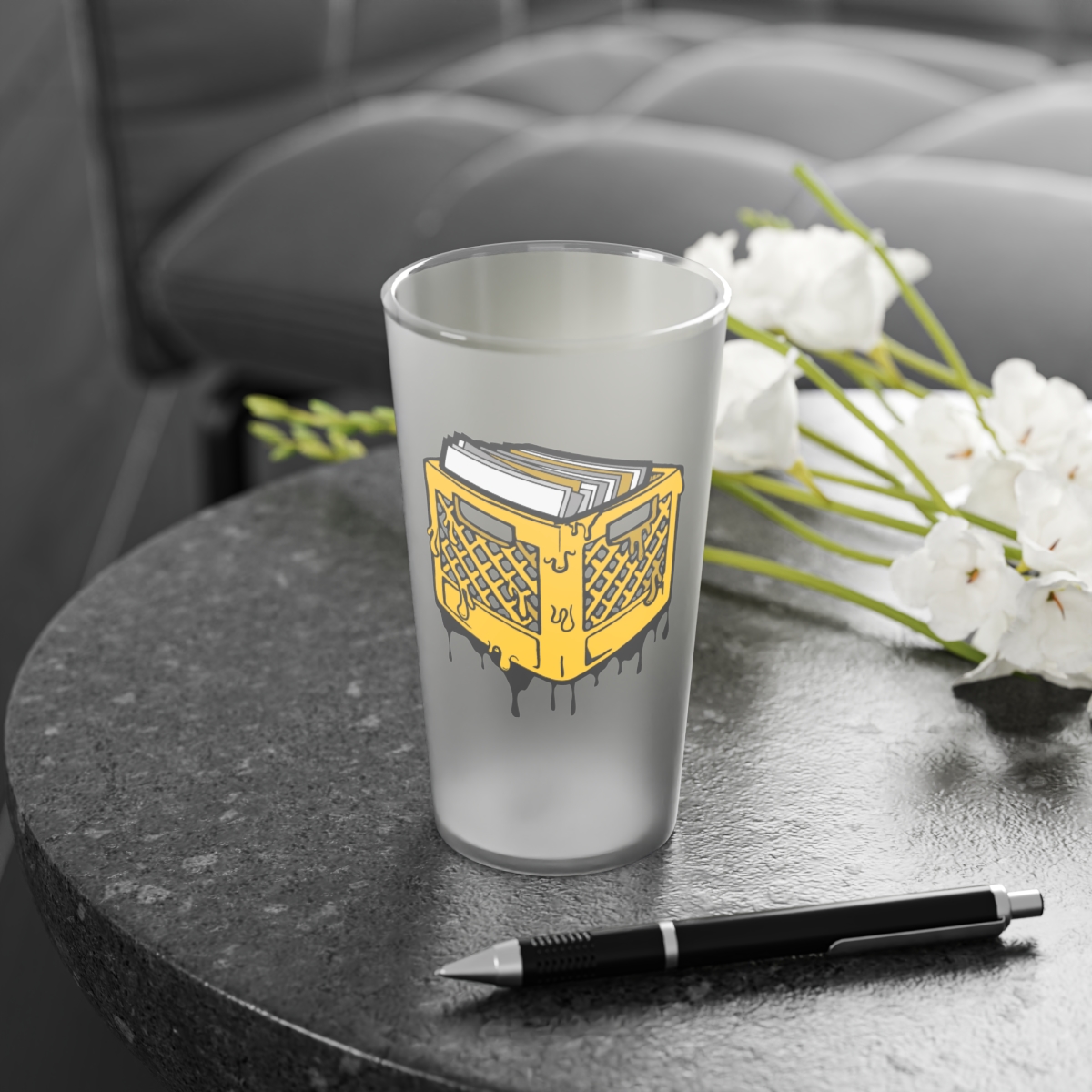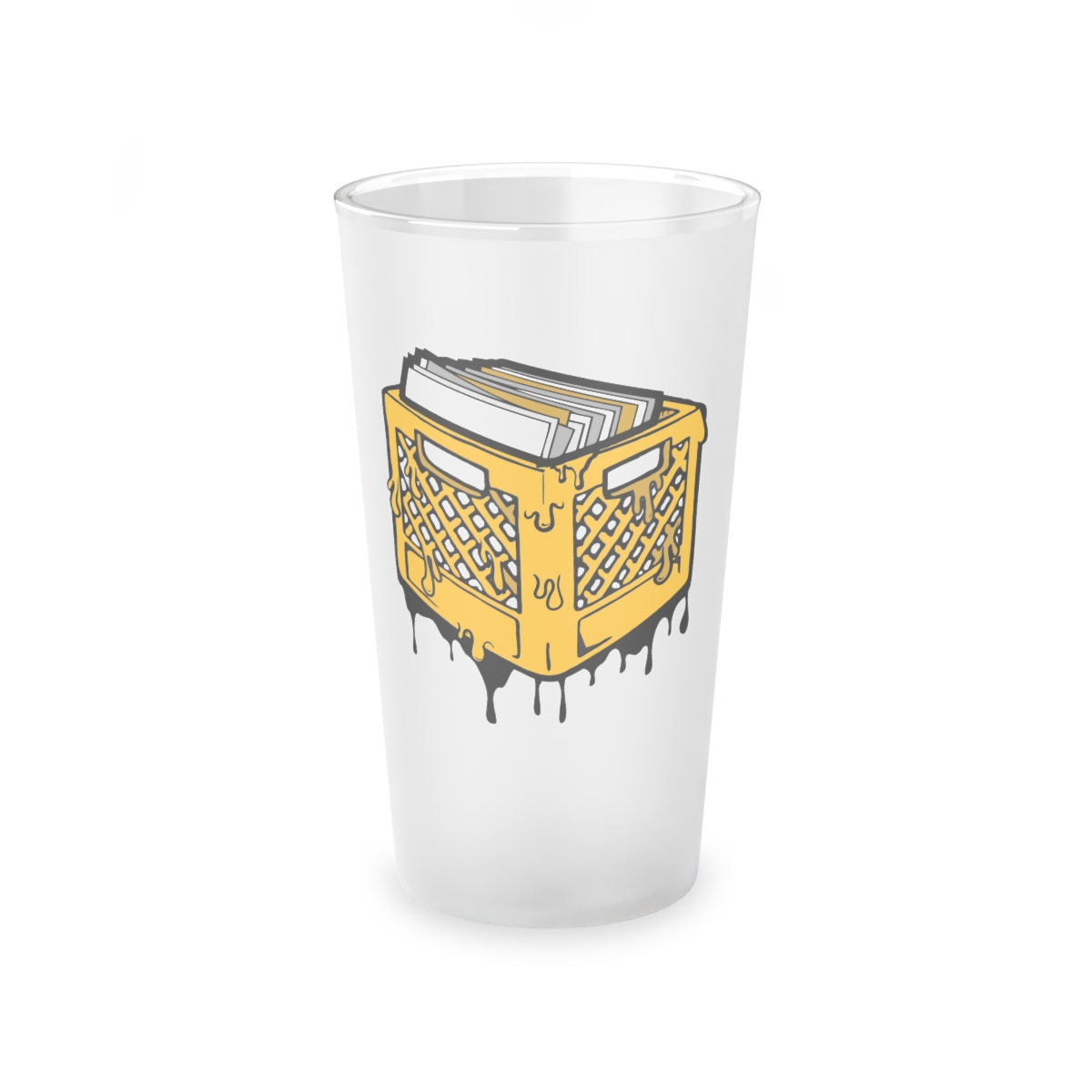 These frosted 16oz pint glasses feature a frosted matte finish and are complemented by the primary Crates logo.